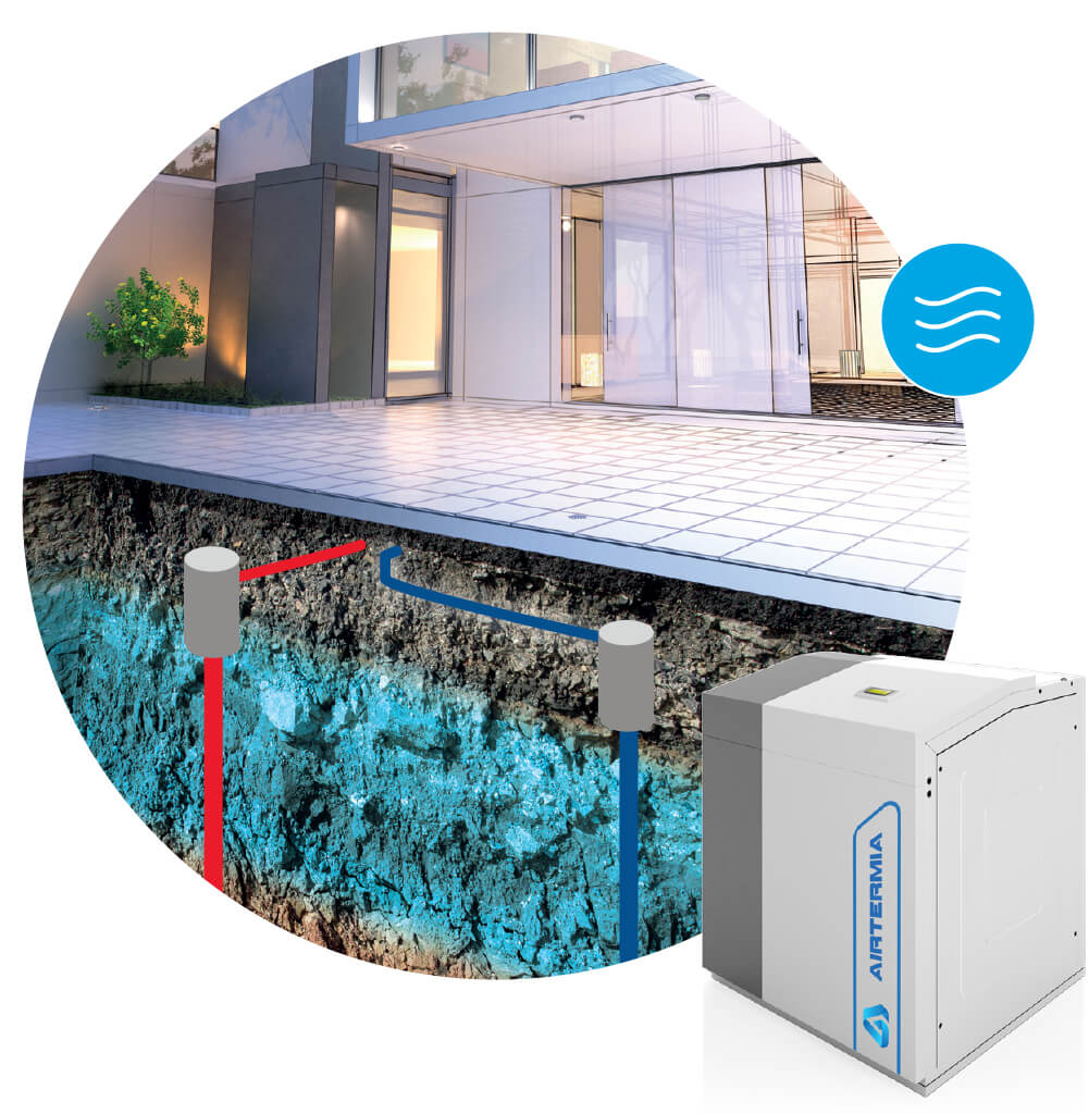 Le pompe di calore geotermiche Airtermia possono utilizzare il calore dell’acqua presente nel sottosuolo. Richiedono l’installazione di pozzi di prelievo e pozzi di scarico che necessitano rispettivamente di concessione e di autorizzazione. Con tali opere si può estrarre calore gratuito per riscaldare gli edifici in inverno e per produrre acqua sanitaria, oppure si possono raffreddare gli edifici in estate cedendo calore in eccesso presente nell’edificio, trasmettendolo alle falde sotterranee.