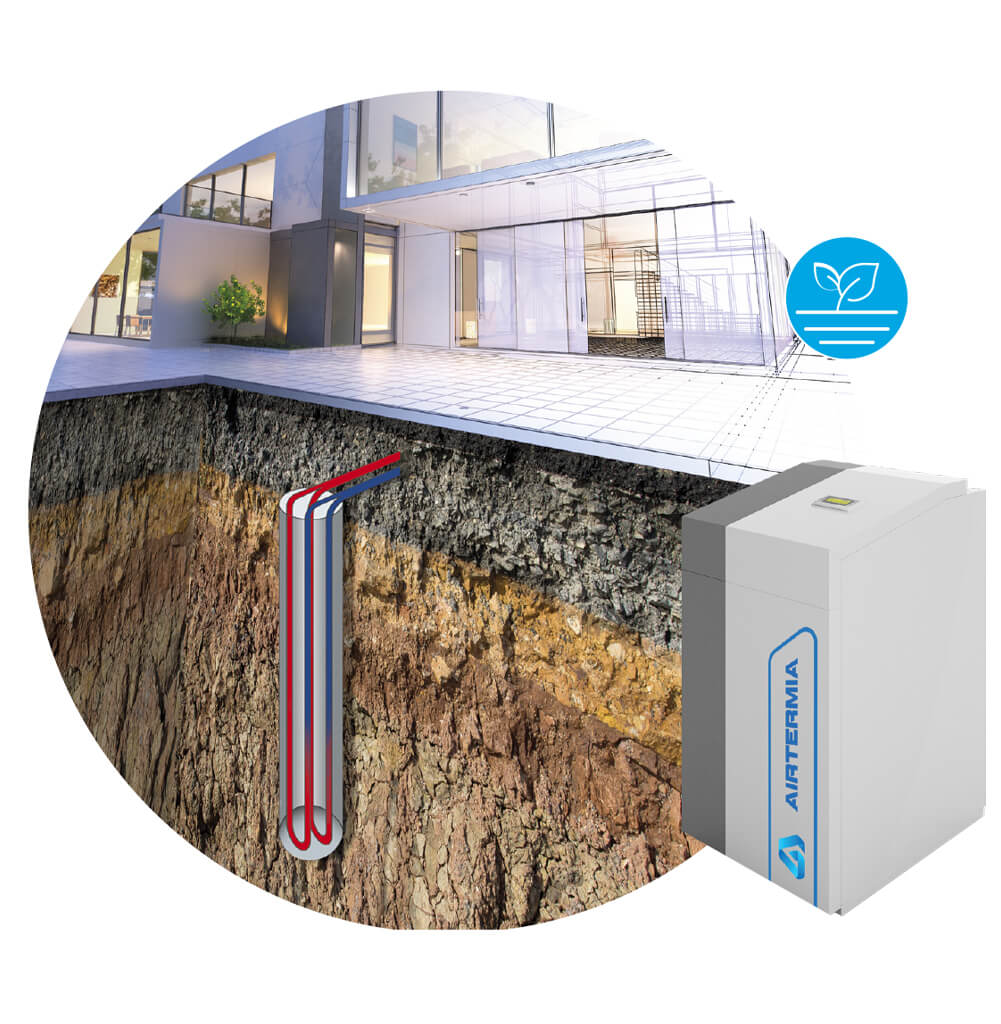 Le pompe di calore geotermiche Airtermia utilizzano il calore sotterraneo, che è a temperatura costante tutto l’anno, per riscaldare gli edifici in inverno e per produrre acqua sanitaria. Che si tratti di sottosuolo roccioso o detritico poco importa. Realizzando le sonde geotermiche di profondità fino a 80 m o da 80 a 150 m, attraverso la perforazione del terreno, si può estrarre questo calore gratuito ovunque.